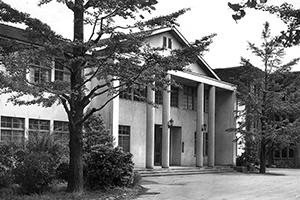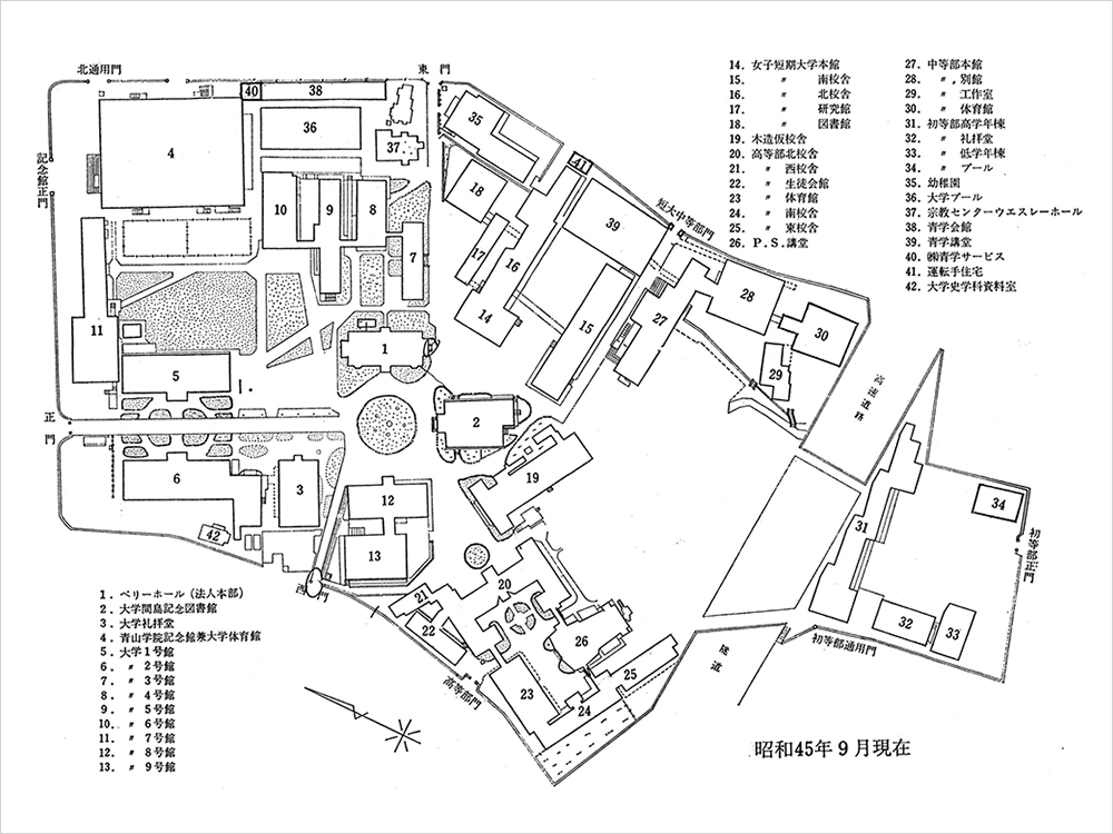 1950年に女子短期大学が発足した時、校舎は戦後の女子専門学校の時代の木造二階の本館(1949年建造)と木造平屋の別館(1948年建造)、1949年建造の木造二階の本館が使われました。別館には物理実験室、化学実験室、音楽教室、一般教室の4教室が、本館には1階に事務、学長室、講師控室、家政科実験室等、2階には研究室、一般教室等が配せられていました。この本館は正面がシンプルながらも4本の列柱と三角破風の印象的な建物でした。短大が開校すると教室不足は避けられず新校舎が必要となり、北校舎の西側部分が1961年に完成します。1966年には短大本館が建設され、事務室は旧木造校舎から移転しました。翌年、南校舎も完成します。1968年から1969年に北校舎の増改築が行われ、1968年研究館が完成し、短大図書館や青山学院講堂も1969年に建設され、こうして短大の主な建物は1960年代に築かれました。その後、大きな建物としては1980年に体育館が建設されています。
