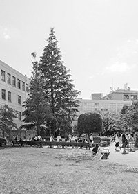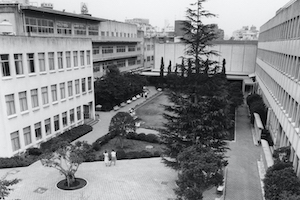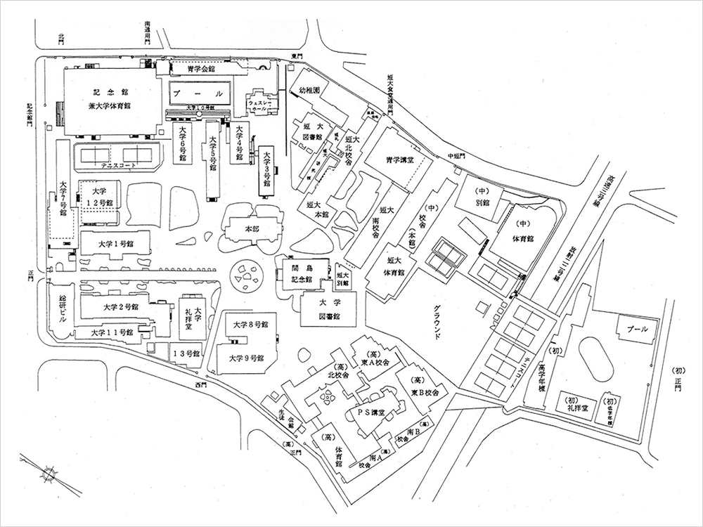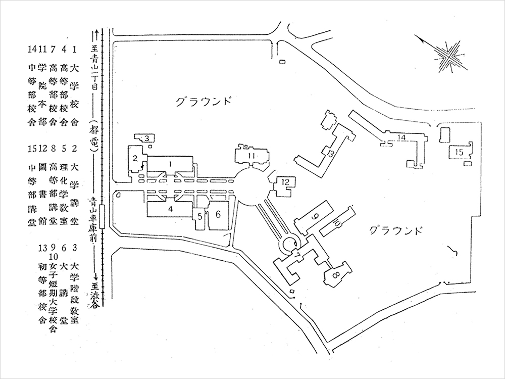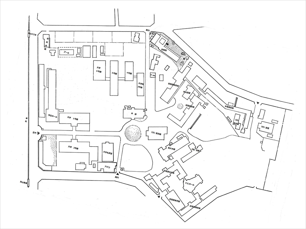 青山学院女子短期大学が発足した1950年には短大の敷地は青山キャンパスの正面から入って突き当たりの間島記念館の右側にありました。これは戦後の女子専門学校、さらには女学院の敷地にあたります。もともとは1888年に青山女学院が青山学院から借用したのがこの西南の一角であったことに由来します。間島記念館の左側は、初等部の敷地(校舎と運動場)となっていました。1959年に青山学院は南に隣接する地域3000余坪を購入します。ここに初等部の新校舎が1964年に建設され、初等部が移ることになり、跡地に短大の新校舎が建ち、短大の敷地となりました。ただし新校舎は順次、整備されたため一挙に移転とはならず旧校舎との併用の時代が1960年代末まで続きます。以降、半世紀を超えて、間島記念館の東側、中等部と幼稚園にはさまれた土地が短大の校地となり、学生はこの場所で学園生活を過ごしたのです。その最終の面積は約3万700平方メートルで、青山キャンパス全体の4分の1にあたりました。