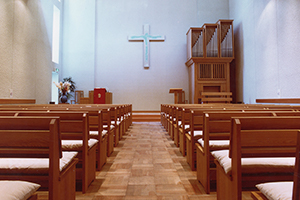 戦前の女子部の礼拝は1924年建設の新体育堂を経て1939年完成のプラット記念講堂で行われていました。同講堂は1945年の空襲で外壁を残すだけとなりましたが、伝道局の援助を得て1951年に再建されました。この建物は建設と再建の募金に尽力したスプロールズの名前を付してプラット・スプロールズ記念講堂(通称PS講堂)と呼ばれ、高等部との共用で礼拝や会合の場として使われました。1969年に中等部との共用で青山学院講堂が完成し、PS講堂は高等部の専用となります。青山学院講堂はできたものの、同施設は多数の参加する行事には適していても、日常の礼拝を行うには適切とは言い難く、相応しい場を求める声を受け、短大図書館と北校舎の間に、収容人員150名規模の小礼拝堂が1983年に建てられ、ここにようやく短大が望んだ姿で礼拝の時間が持たれることになりました。十字架の製作は掛井五郎教授によるもので、翌1984年にはパイプオルガンが設置されました。