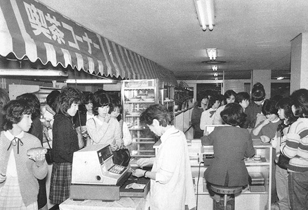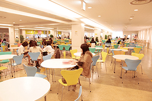 1950年代、本学には短大生向けの学生食堂はなく、学生は昼食を教室でとるか大学の食堂を利用するなどして過ごしました。食堂建設を求める声が上がり、1960年に青山学院85周年記念事業として2階建ての学生ホールが建設され、その1階が食堂とされました。場所は当時の短大の敷地の本館と別館の間です。学生数が増えると、昼休みは学生で一杯となり、昼休み時間が延長されるほどでした。1969年には青山学院講堂が完成し、地階に学生用食堂が設けられます。学生ホールはこの年、取り壊され、以降、青講の地下で学生は昼食をとることになりました。食堂については1997年に改装工事が行われカラフルな北欧デンマーク家具のセブンチェアが導入され、また2003年にも学生の使用できる空間を増やすなどの改装工事が行われ、「とても明るく、いつもキレイなくつろぎの空間となっています」(進学案内)と紹介されました。