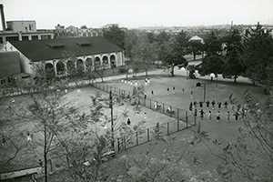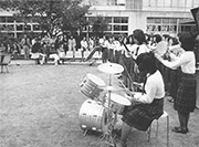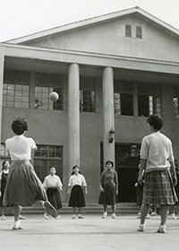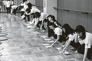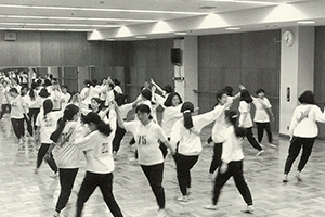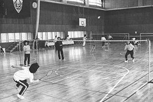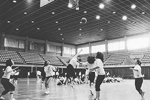 短大発足時にはまとまった運動場はありませんでしたが、1952年に西門脇の土地が短大のミニ総合運動場となり、コートも設置されました。しかし雨が降ると使用できず、1961年に完成した北校舎(西側)には、地階に狭いながらも体育室が設けられました。1964年には青山学院記念館が竣工します。ここには体育施設が付設されていて、大学と共用の体育館として使われ、屋内スポーツも活発に行うことができるようになりました。1965年、大学の8号館・9号館の建設にともない、短大のミニ総合運動場は廃止となります。記念館体育館は共用でしたが大学の敷地内にあり、大学の影響を受けやすく、短大専用の体育館を求める声が上がります。1967年に南校舎が完成したとき、4階に体育実習室が設けられましたが、1980年、長年の悲願であった専用の、地下1階、地上4階の立派な体育館を短大は持つことになりました。2階にはスポーツホールが、地下にはプレイルームがあり、授業や体育団体の活動に利用されるだけでなく、学内外の行事や大会にも使われました。