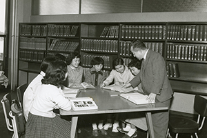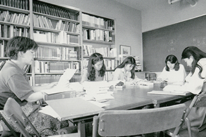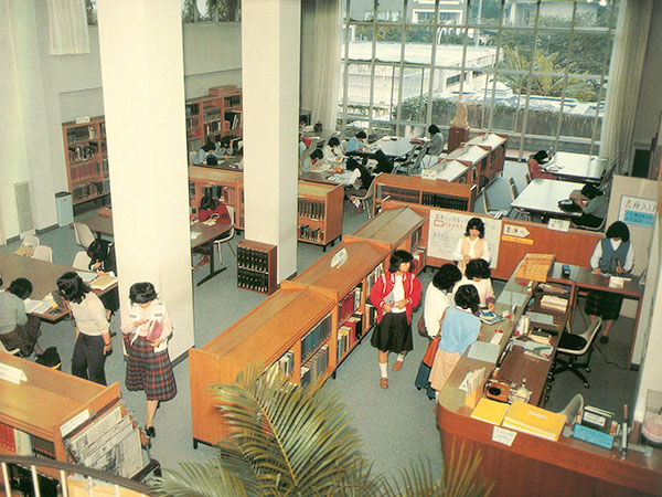 短大が発足した当初は、共用として間島記念図書館があり、短大専用としては本館2階に図書室がありました。蔵書数は設置認可申請書によれば共用図書は6万6千冊、専用図書は3千余冊とされており、学生は多くの本があり、距離的にも近い間島記念図書館を利用したのです。新敷地に移ったのち、1966年に短大の独立した図書施設として図書館棟が完成します。これは地下1階、地上1・2階から成り、一般閲覧室192席、書庫内閲覧机30席ほかを備え、書庫の収容能力は13万冊と充実したものでしたが、蔵書の急増は著しく、1986年には図書館の増築が行われました。地下2階、地上3階で、図書館部分は地上1階までで、地上2階と3階は教員の研究室にあてられました。この新図書館は蔵書数だけを誇るのでなく、コンピューターの積極的な活用、AV資料の収集とそれを閲覧するルームの設置など現代性を持つように設計されました。特色ある図書館づくりということでコレクション形成にも力が注がれたことは記されるべきことです。