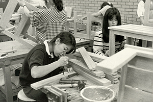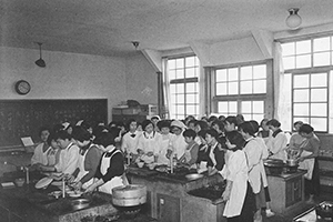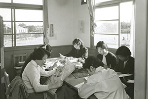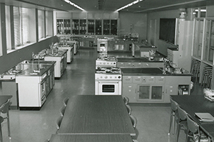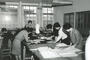 短大発足の1950年時は家政科、1969年よりは家政学科と称しました。入学定員は1950年には100名ではじまり1968年には150名と増員となります。実際には1960年代に入ると150名近い学生を受け入れており、1966年には生活科学を主とするAコース、生活デザインを主とするBコースに分け、1967年からは前者はⅠコース、後者はⅡコースと名称を改めました。1976年には入学定員はⅠコースで100名、Ⅱコースで100名と定められました。1989年の芸術学科の誕生に際しては、各コースの入学定員を20名ずつ削減し、1994年からはコース別の募集をやめ、160名の入学定員となりました。2006年に子ども学科3年制が開始されると、これに合わせ、10名減を行い150名といたしました。2012年に現代教養学科がはじまり、2014年度限りで家政学科は閉じましたが、この間の卒業生は11,218名に及びます。歴史は古く、青山女学院の時代に家政科は英文専門科が廃止となったとき、代わって1921年に設置されており、以降存続し、それが短大に継承されたものです。1967年に南校舎が完成し屈指の施設を備えましたが、生活者の視点を重んじ、文系の学問も配慮し「快適で人間性豊かな生活とはどうあるべきか」を人文・社会・自然科学を跨いで総合的に追求しました。