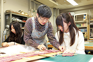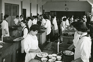 家政学科に学んだ人は講義のことは忘れても、実験・実習をしたことは覚えている人が多いのではないでしょうか。2016年に発行した『青山学院女子短期大学六十五年史―文集編』には多数の卒業生が原稿を寄せて下さいましたが、家政学科卒業生は実験・実習の思い出を書いている人が目立ちました。それは短大が発足した頃の1950年代の卒業生から現代教養学科の2010年代の卒業生まで共通しています。発足当時は食物(栄養学、食品学、調理学)と被服(被服構成、被服材料学、被服整理学)の両方が、実習を通じて学ばれましたが、その後は学科内の編成や、カリキュラムの違い、施設設備の都合や、担当者の都合より、実習で経験した内容は異なることになります。和調(日本料理)、洋調(西洋料理)、和裁、洋裁、懐かしい言葉ではないでしょうか。現代教養学科になっても人間社会専攻に被服構成実習と調理学実習が開講され、人気がありました。