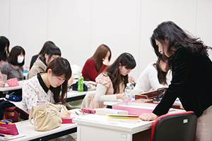 女性の高学歴志向、ライフスタイルの変化は卒業後の進路選択にも変化をもたらします。1950年代は卒業後の進路に「家事・手伝い」が多く就職者の比率は30%前後でしたが、1963年には64%(文部省による短期大学卒業生の平均就職率55.2%)、高度経済成長を背景に増加し1980年代中頃に89%前後のピークを迎えます。学科を卒業してすぐに就職する人の割合はその後減少し2010年頃には50%を下回りました。一方、進学者が増加し、短期大学ファーストステージ論が唱えられるようになる1990年代末頃から編入学支援に積極的に取り組むようになります。それまで分かれていた就職・編入学・留学の各支援は、2012年の改組を機に2013年キャリアサポートルームが開設され教職員で構成される運営委員会によって統括されることになりました。常駐のキャリア・カウンセラーによる個別相談、カウンセラーや教員によるセミナーなども開催され、学生のニーズに合わせたきめ細やかなキャリアサポートが行われました。