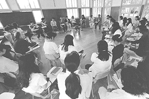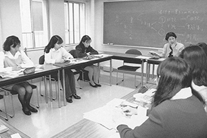 青山学院女子短期大学は学則で、青山学院という総合学園の中で、女子教育を担当する、女子の教育に専念すると謳いましたが、保健体育(健康科学)など一部を除き、基本的には教えられる科目や内容は共学の大学と変わるものではありませんでした。その中で1970年代から1980年代にかけ、女性が女性の問題を、自分の学問として考える「女性学」が生まれ、学会が成立したり、大学で関連授業が開講されたりするようになります。日本では1974年に和光大学に開かれた「女性社会学特講」が最初の例とされますが、広がりの始まりは1983年頃で、本学でも1984年に英文学科英文専攻に「女性学」と名づけられた科目が置かれ、翌年には英語専攻でも開講されるようになりました。中性的な「人間」としてでなく(それは、実際は男性を指していました)、学生が自分の問題として社会や文化をとらえる授業が本学の中で始められるようになったのです。1998年からは共通教育科目(主題科目)に移し、全学に開かれました。家政学科では独自に1990年より「女性論」を開きます。2012年より始まった二学科体制ではより自覚的に現代教養コア科目の第Ⅰ群を「女性と現代」とし、関連科目を多く開講しました。こうして既存の専門の学問の修得を超え、「女性として生きること」の意味を総合的に考える時間がつくられたのです。