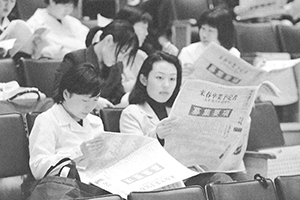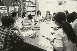 学生の自治組織・学友会は短大発足当初、部室建設の資金を集めるために1952年から数回にわたって有名人を招いて音楽会を開き、後援会・卒業生の寄付も合わせて1956年に部室を完成させました。一方1950年代半ばから一般学生の無関心さ、クラブ活動の低調さが問題となり1960年代には組織再編、規約改正が頻繁に行われました。1969年、全国的な大学紛争の高まりの中、新聞部を中心とする運動、文化系クラブの組織・文化団体連合会により大学側に、学生の表現活動に対する大学の対応をめぐって公開質問状を提出したりしました。学友会新聞班(部)は1951年6月に『青山学院女子短大新聞』を創刊、1974年5月まで24年にわたり全107号を発行しました(復刻版が2000年に作成されています)。掲載されている記事からは時代ごとの学生の生の声や内面的葛藤を読み取ることができます。