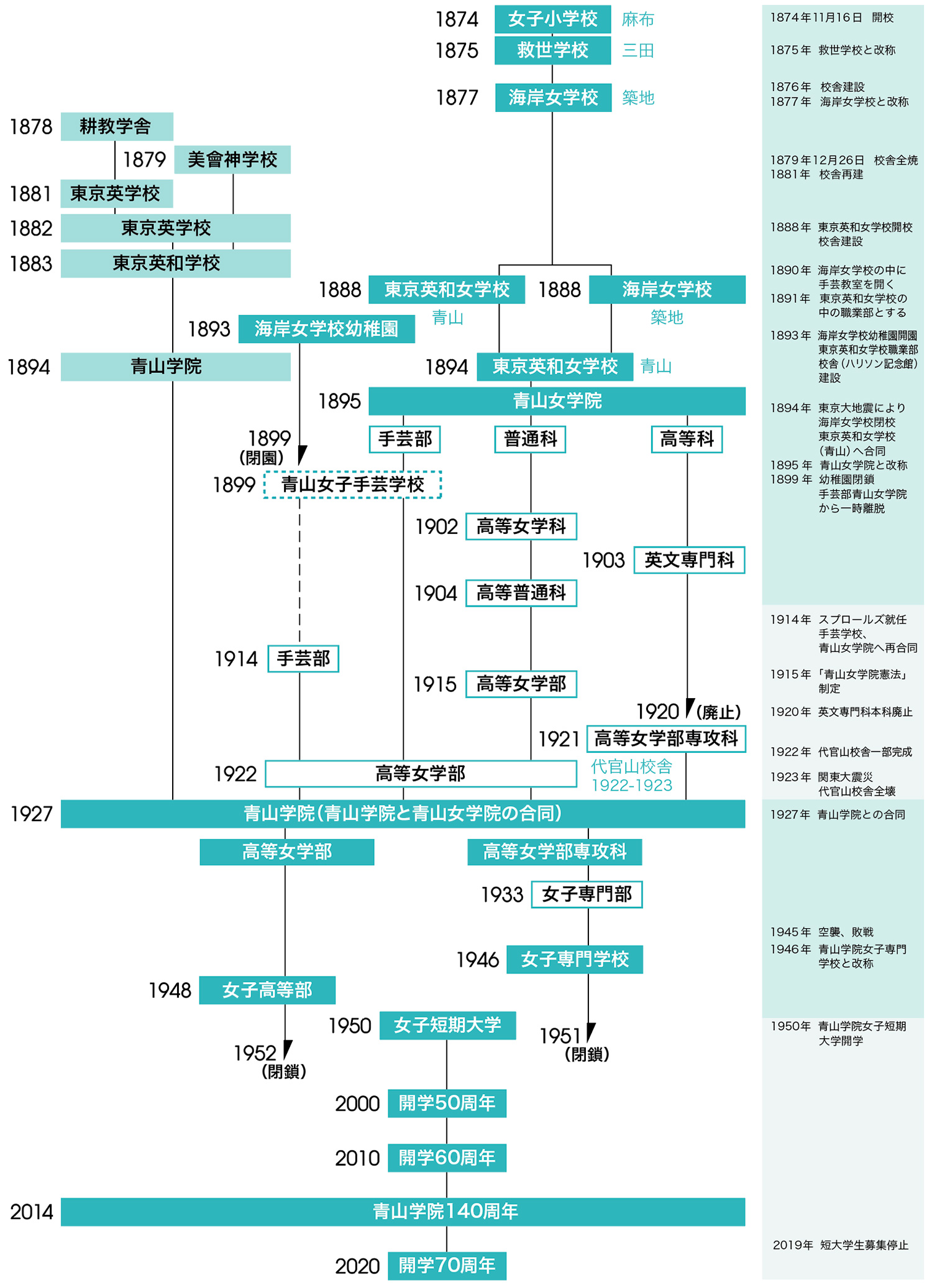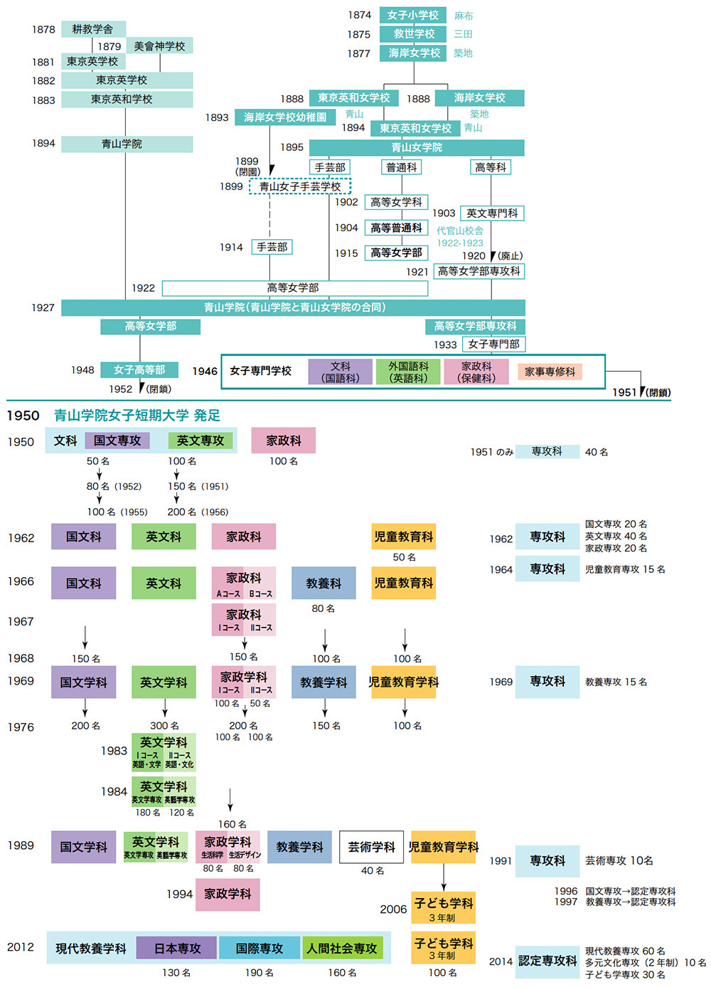 青山学院は三つの源流をもち、そのうち最も古い1874(明治7)年に始まる女子教育の歴史を引き継ぐ学校として青山学院女子短期大学は1950(昭和25)年に誕生しました。