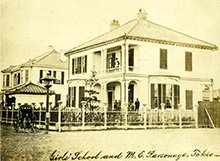1874(明治7)年11月16日、米国メソジスト監督派教会女性海外伝道協会宣教師で23歳のドーラ・E・スクーンメーカーが、津田梅子の父、津田仙の協力を得て麻布で女子を対象とする英学塾を開きました。生徒7名の「暗き場所におけるまことに小さな光」でした。