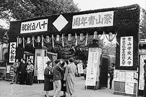 青山祭は1954年、青山学院創立80周年を記念して大学と短大との合同文化祭として始まり、各クラブの催し物を中心に行われました。短大独自で行われるようになったのは創立15周年にあたる1965年からで、「短大生よめざめよう!」のテーマのもと、従来のような催し物の他に公開討論会「短大生の主体性は何処に」が行われました。テーマや内容は時代と共に変化し、その時代を代表するライブ(音楽祭)や講演会(のちにトークショー)のゲストの顔ぶれにも、短大生の関心のあり方がうかがえます。新聞記者や女性問題に詳しい識者を招いた講演会のような硬派な企画がある一方で、いわゆるフィーリングカップルのような企画も行われていました。1972・73年には「学生の無関心」が原因で青山祭中止の危機に見舞われました。高度経済成長下、大学進学率急増による大学の大衆化・学生の意識の激変という、当時の社会状況の表れと言えるのでしょう。青山祭実行委員には多くの学生が参加し、2019年まで学生の関心を反映した青山祭が毎年賑やかに催されました。