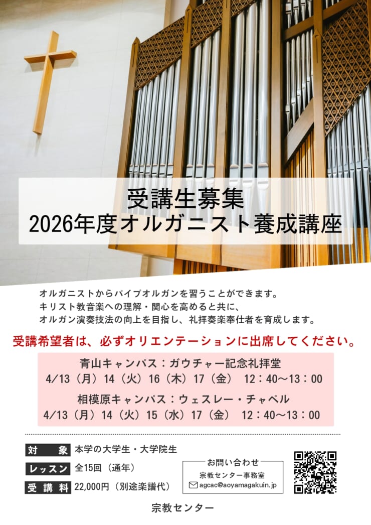 キリスト教会と音楽とは歴史的に密接な関係をたどってきました。とくにパイプオルガンは神を讃えるためのすぐれた楽器として、古くから教会の礼拝のなかで用いられてきました。オルガニストは、牧師と共に礼拝をリードして礼拝全体の雰囲気を醸し出し、人々を聖なるものへと導いていくという大事な役割を果たします。本講座は、2003年に開講されて以来、多くの学生たちが講座をとおして、オルガンの魅力と礼拝という青山学院の建学の精神の源泉に触れてきました。まだ教会生活をしていない人でも、本講座の目的を理解するならば、オリエンテーションならびにオーディションを経て、本講座を受講することができます。ぜひふるってお申し込みください。